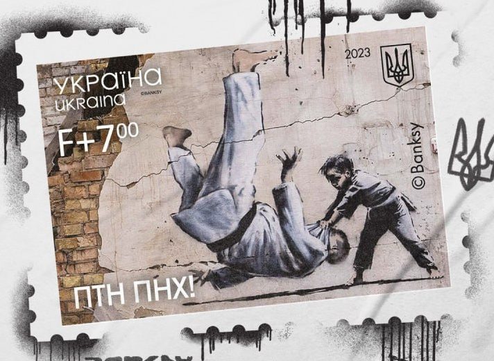 Bilden på frimärket kommer från en bild som den brittiske graffitikonstnären Banksy har målat på en husvägg nära Ukrainas huvudstad Kiev. Banksys konst är väldigt känd men det är inte känt vem Banksy egentligen är.